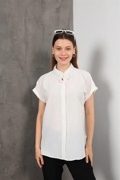 Dantel Yaka Kısa Kol Gofre GömlekKADIN GÖMLEK